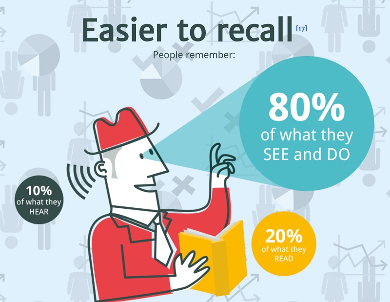 Research shows that people remember 10% of what they hear, 20% of what they read, and a whopping 80% of what they see and do.