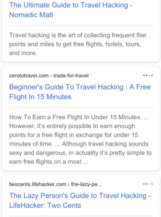 For example, when I entered the keyword “travel hacking,” into Google, below are the titles of sites that appeared in Google search results.