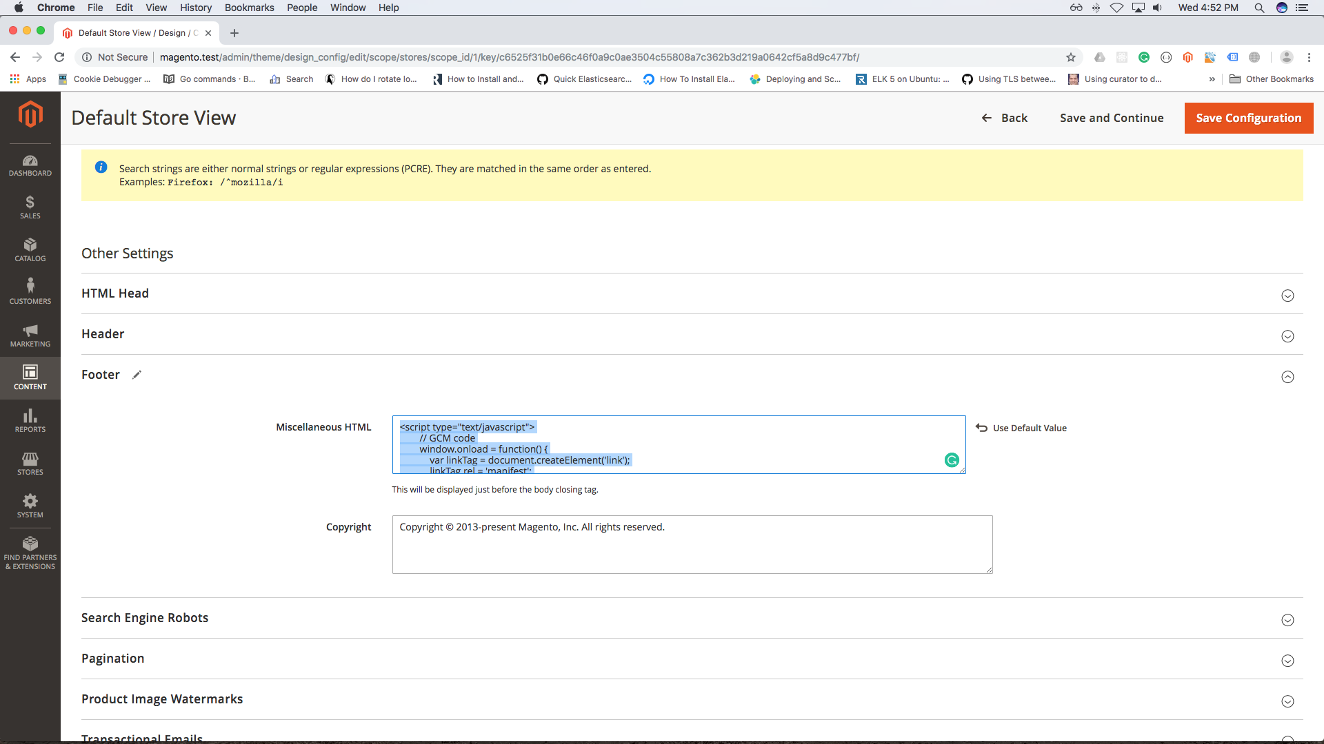 Paste the code in the ‘Miscellaneous HTML’ box. Now click on the Orange button at the top left, called ‘Save Configuration’.