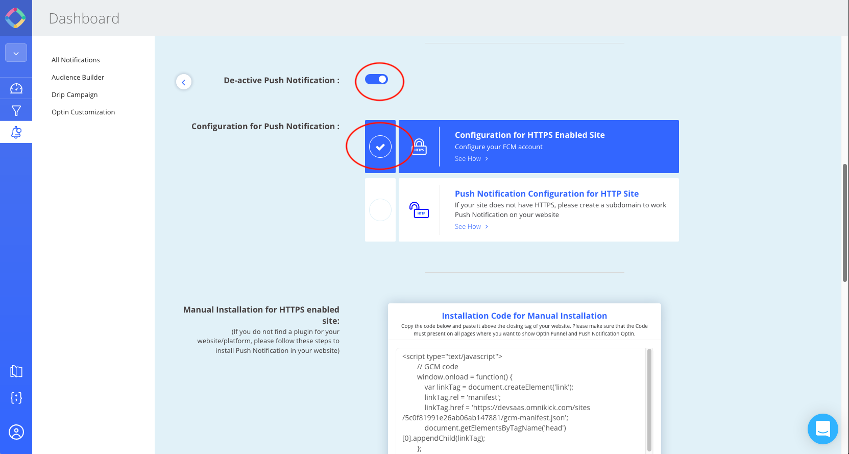You can also use the short code, to configure push notifications for HTTPS using OmniKicks ‘Manual Installation Code’.