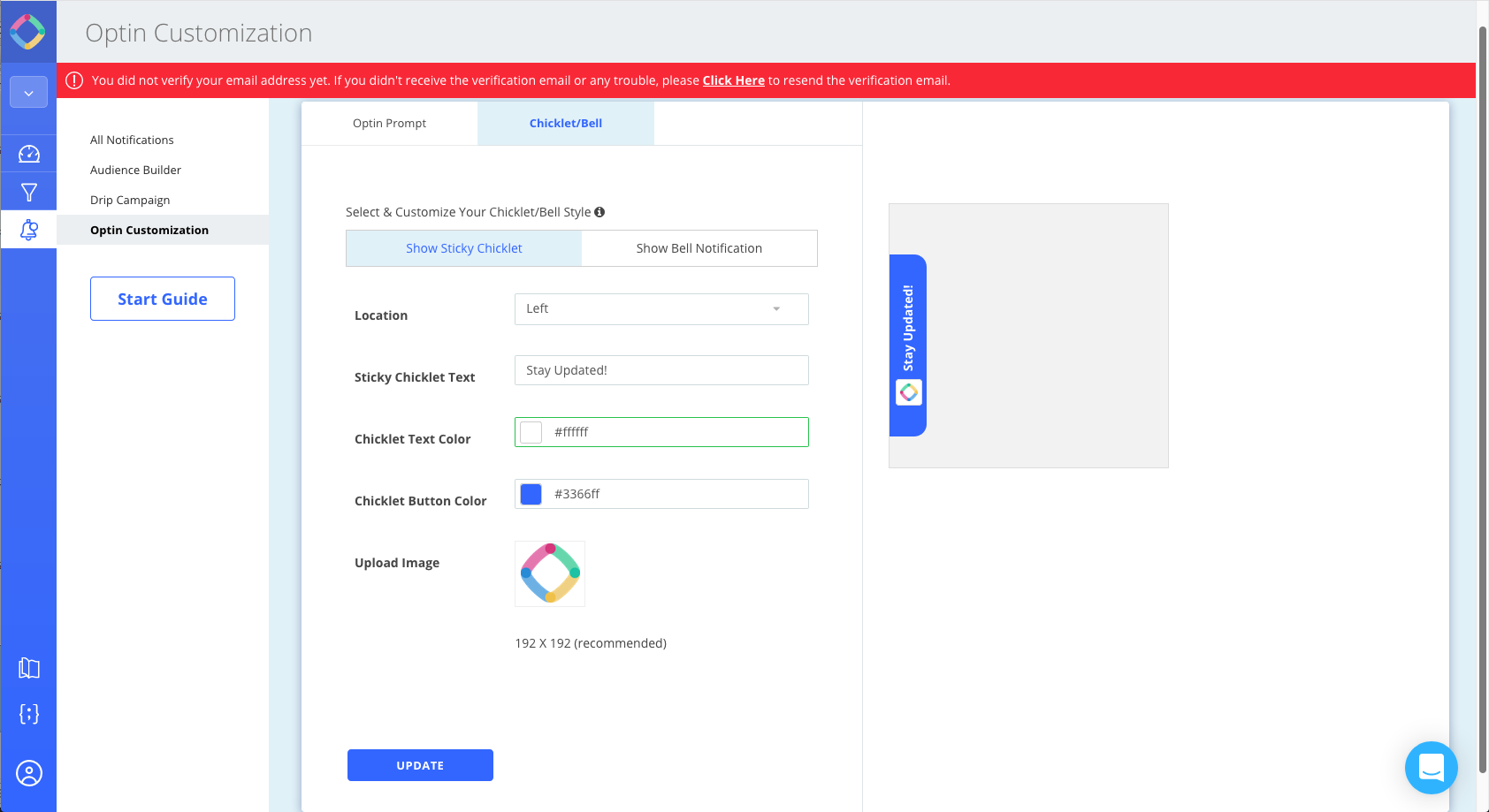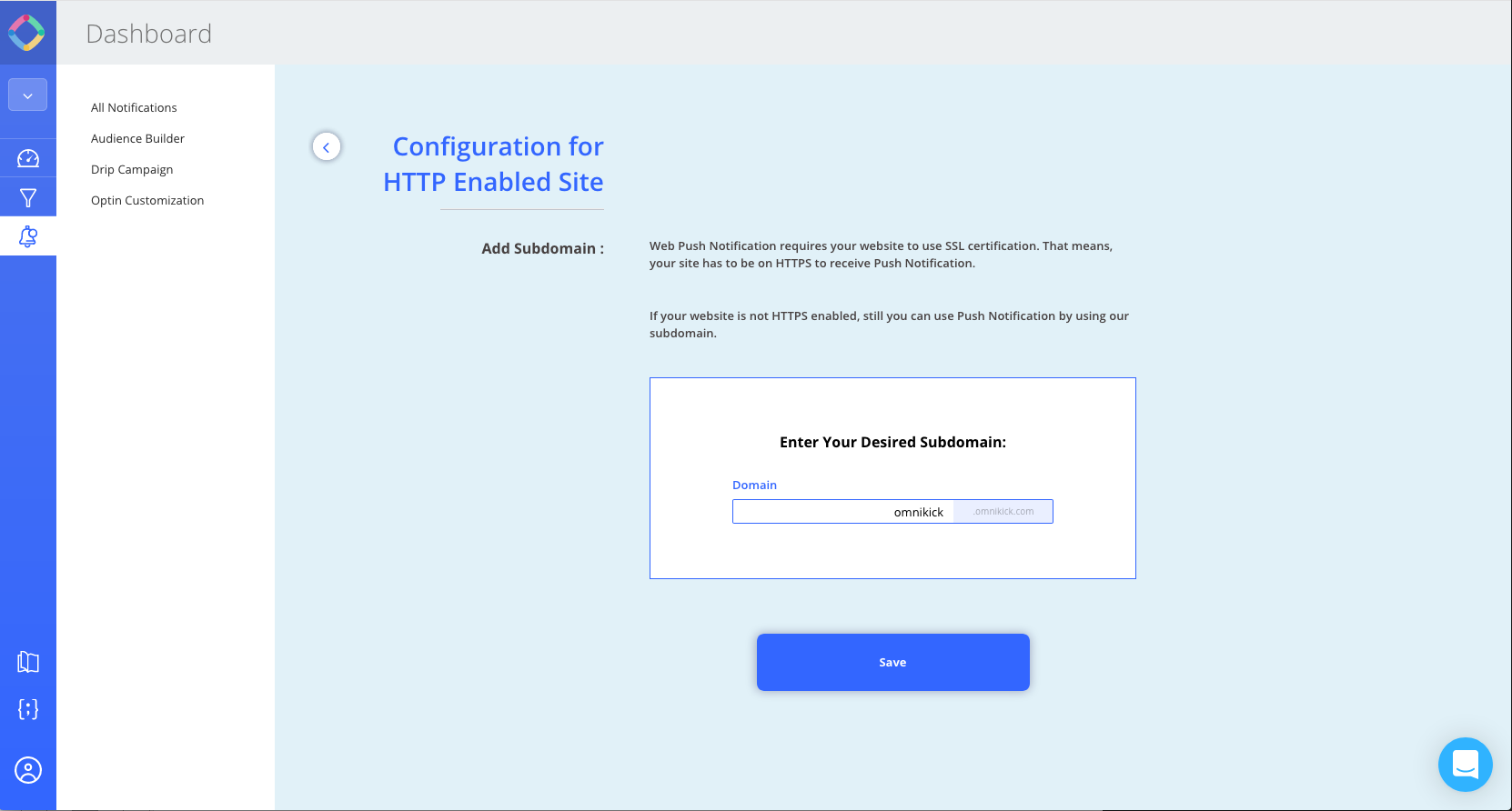 Here, you need to create an intriguing opt-in prompt that provokes your user’s interest to get push notifications. After fill up all the boxes, and upload your business logo, click on ‘Save’.