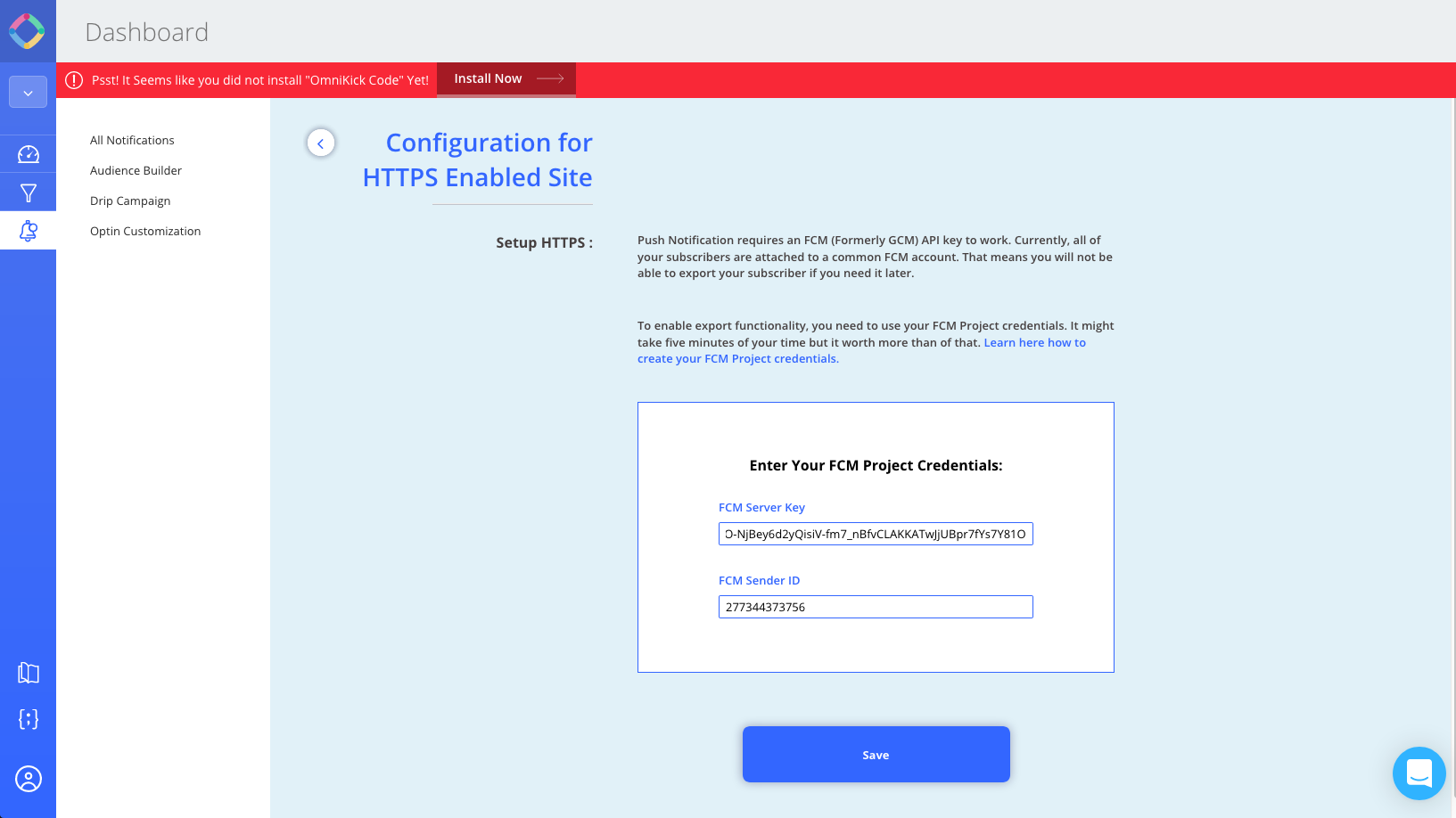 Enter your FCM server key, and FCM Sender ID. Then save the page.