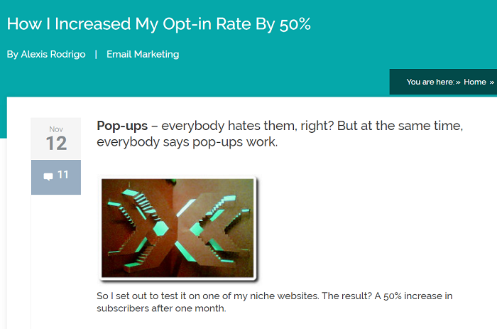 Alexis Rodrigo wrote about increasing the opt-in rate by 50% on one of her niche sites.