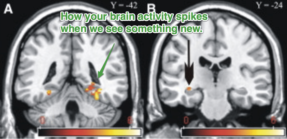 “When we see something new, we see it has a potential for rewarding us in some way. This potential that lies in new things motivates us to explore our environment for rewards. The brain learns that the stimulus, once familiar, has no reward associated with it and so it loses its potential. For this reason, only completely new objects activate the midbrain area and increase our levels of dopamine.”