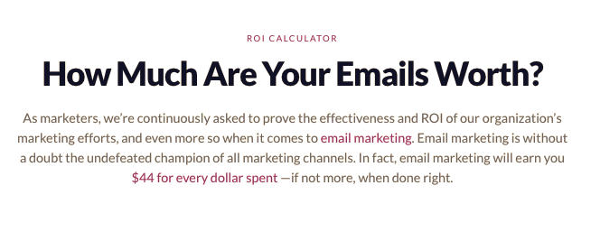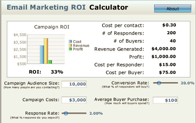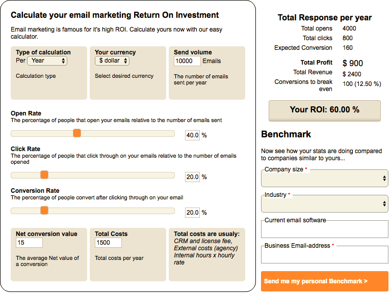One of the most popular email marketing ROI calculators online. It is a separate website with enhanced tools to calculate your ROI. Just put your data and let the tools calculate them. Put your industry name and email address.