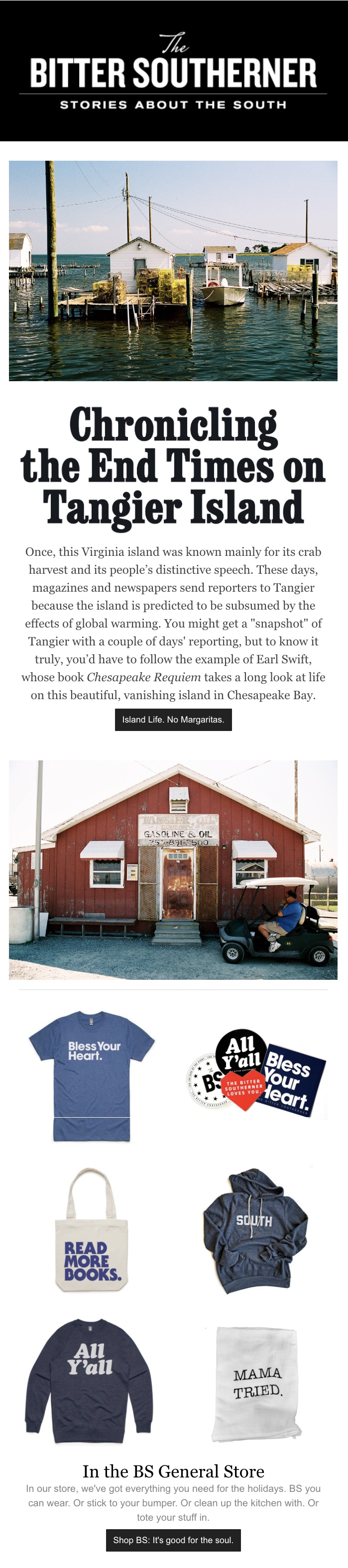 A publication company ought to send news about their publication. Bitter Southerner believes they can add more value to their newsletter. So, not only the top story for potential readers but their newsletters also contains relative fashion items which may evoke customers interest to make a purchase. These items inevitably focus more on their branding and reading, etc.