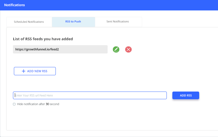 Automate your RSS to Push notification with few clicks. Send every update of your RSS feed as a push notification to your subscriber.