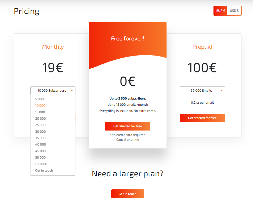 Sender has a flexible price list. You can choose to pay monthly price according to the number of subscribers or pay for the amount of email you want to send (credit system*).
