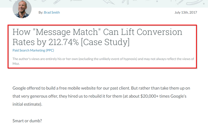 Brad Smith, the founder of Codeless, a B2B content creation company, recently published a case study on Moz titled “How ‘Message Match’ Can Lift Conversion Rates by 212.74%.”