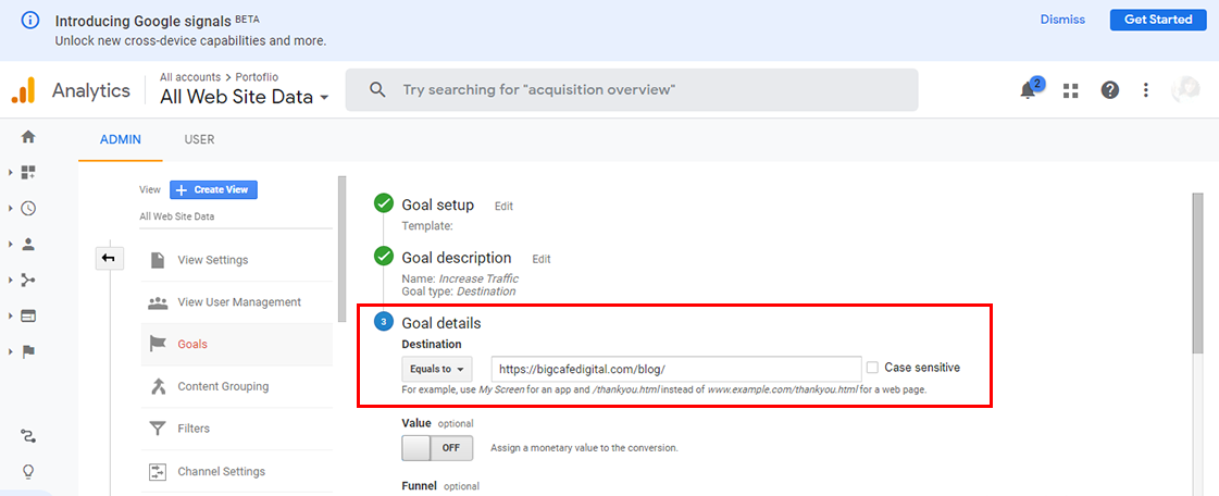 - Under ‘goal details,’ select the landing page for which you want to record this data. Here, you need to fill in the URL of your landing page without the domain name.