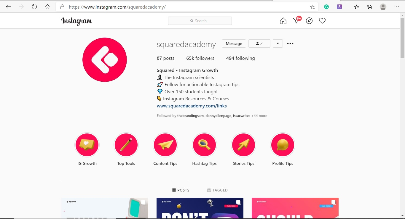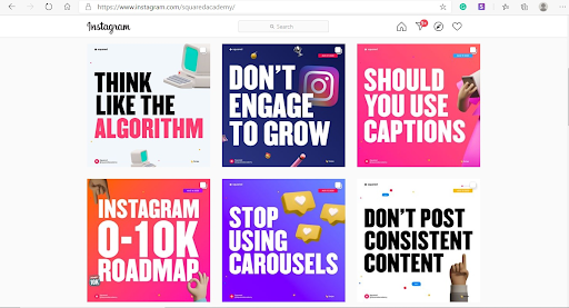 On Instagram, SquareAcademy maintains a joyful theme of pink and contrasting colors keeping everything consistent from the design layout to the font in every post that perfectly defines their brand.
