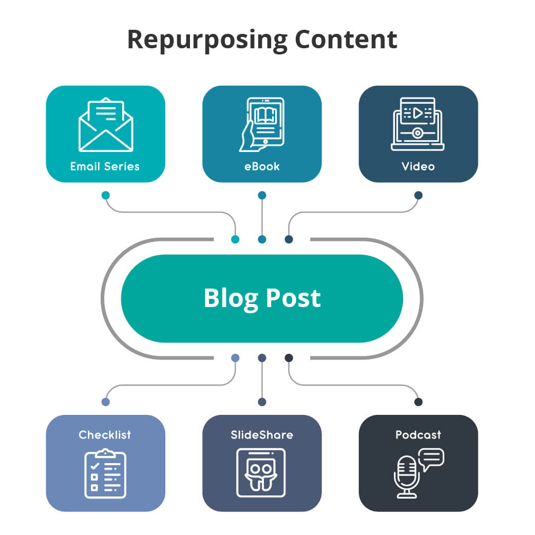 This blog post repurposing workflow by Social Champ broadly explains how you can break a single piece of content into different formats for maximum reach.