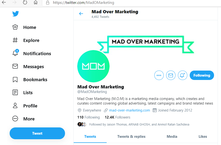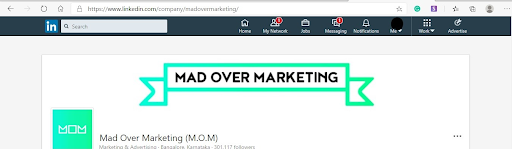 Here, Mad Over Marketing (M.O.M), an advertising and marketing agency, has the same profile and cover picture on both LinkedIn and Twitter.