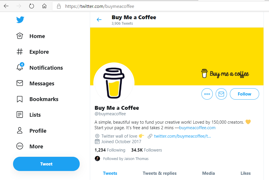 On Twitter, Buy me a Coffee has a crisp bio that tells the users what they do and the next step they should take, ‘create a page,’ they further go on to say, it only takes 2 minutes to enroll a bit of humor too.