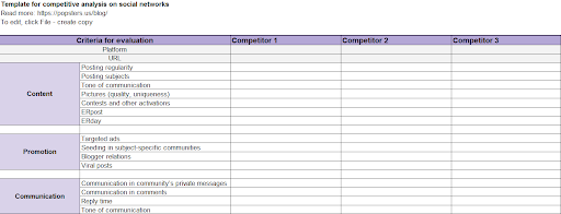 This competitor analysis template by Popsters is an excellent example of how you can analyze your social media competition. Or consider making a template along the same lines by tweaking elements as per your requirement.
