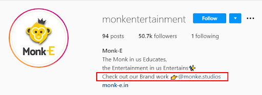 Monk Entertainment asks its audience to check out their brand work, a great CTA, to redirect the audience to another brand page.